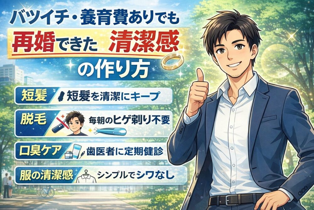 特別な恋愛テクニックも、イケメン要素もなし。意識したのは収入と清潔感だけ。バツイチ・養育費ありでも再婚できた僕が、「最低限これだけやればOK」という身だしなみを正直に書きました。 -